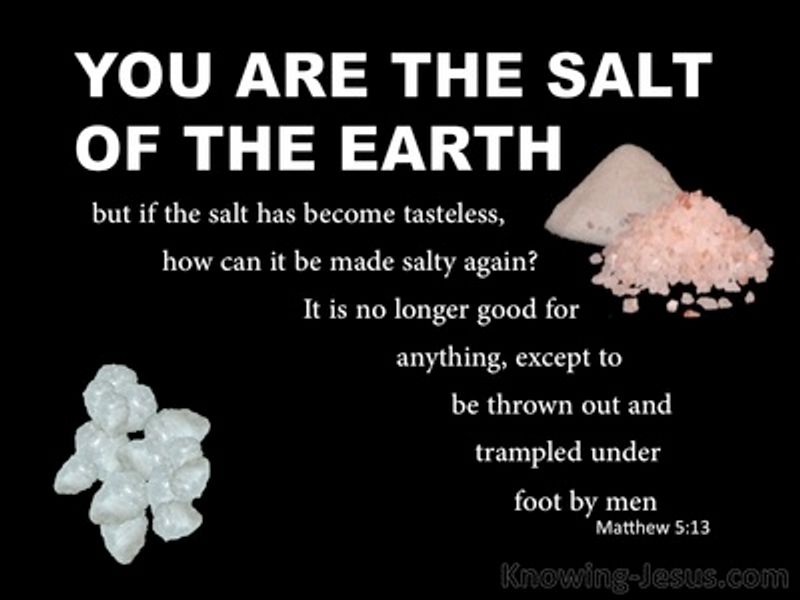 13 “You are the salt of the earth. But if the salt loses its saltiness, how can it be made salty again? It is no longer good for anything, except to be thrown out and trampled underfoot.
